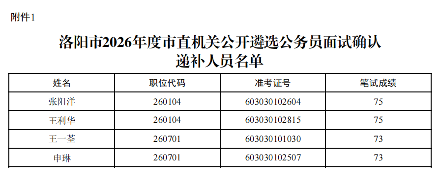 按照《洛阳市2026年度市直机关公开遴选公务员公告》有关要求,面试确认期间出现应试人员空缺的,从报考同一职位达到笔试合格分数线人员中按笔试成绩从高分到低分的顺序,依次递补符合条件人员参加面试,递补只进行一次。递补人员名单见附件1。