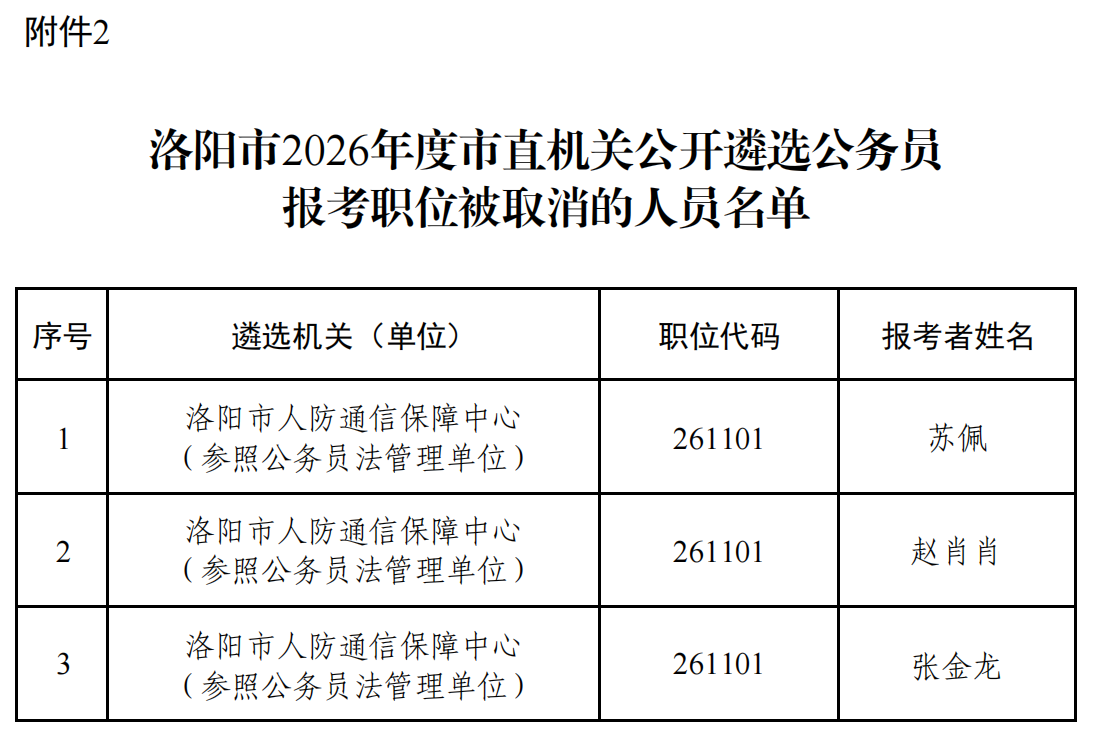 2.洛阳市2026年度市直机关公开遴选公务员报考职位被取消的人员名单