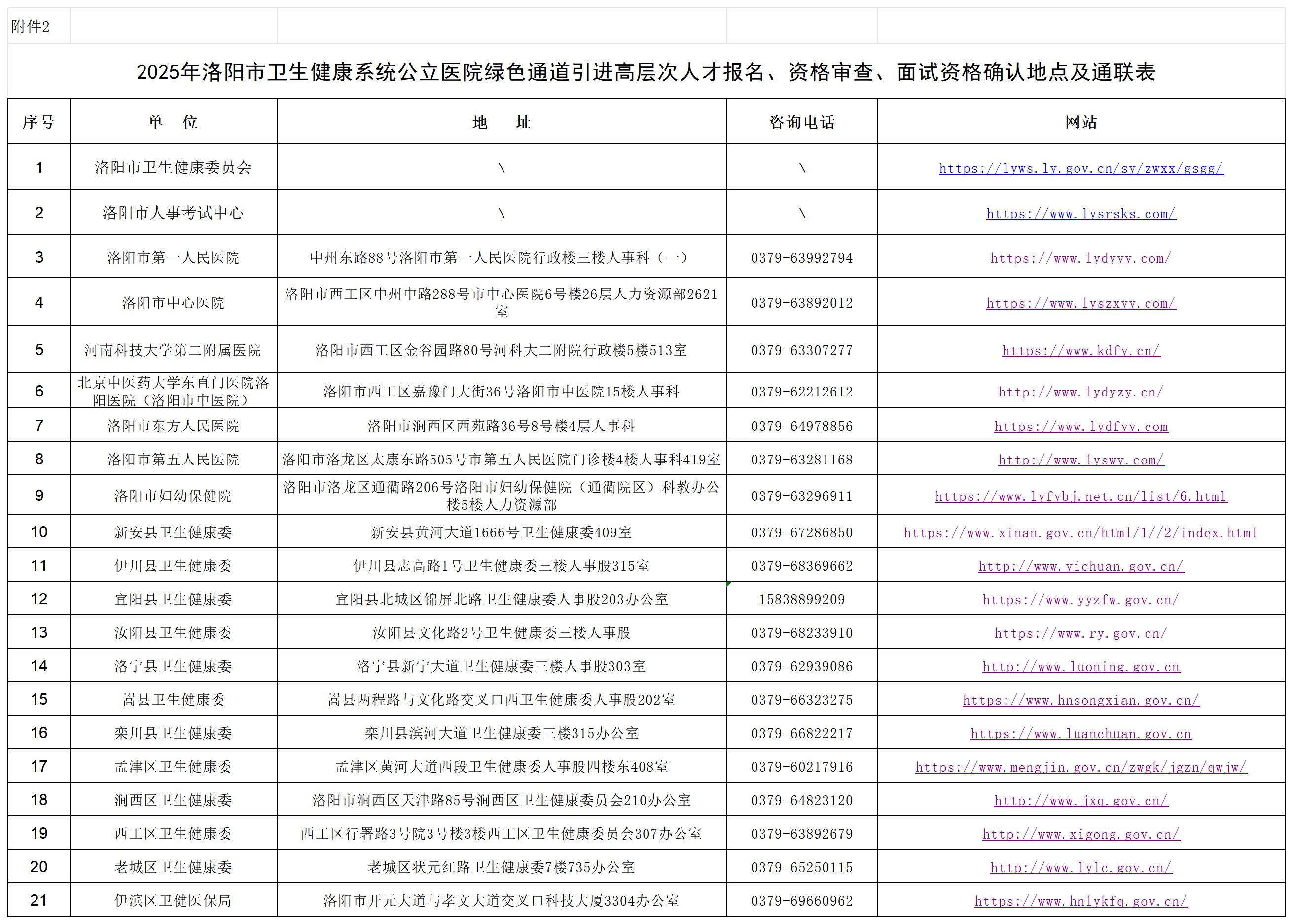2.2025年洛阳市卫生健康系统公立医院医疗卫生机构公开招聘面试资格确认地点及通联表
