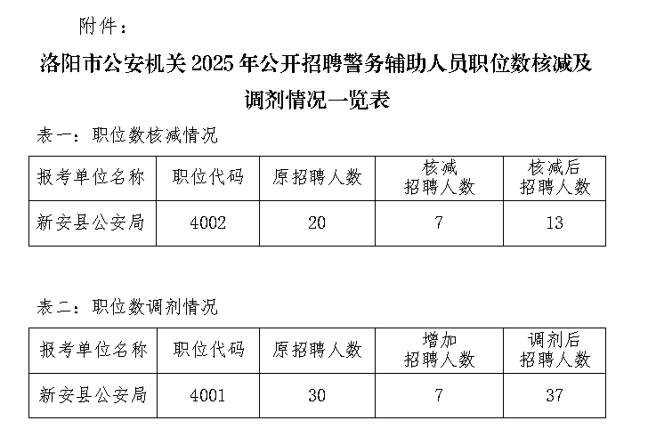 截至2025年12月25日上午12时,洛阳市公安机关2025年公开招聘警务辅助人员报名缴费工作已结束。根据《洛阳市公安机关2025年公开招聘警务辅助人员公告》关于:“各职位报名人数与计划招聘人数的比例不低于3:1。达不到规定比例的职位,相应核减该职位计划招聘人数,核减的职位数,根据报名情况调剂至同一招聘单位的其他职位”之规定,现将此次招聘职位数核减及调剂情况予以公告,详见附件。
