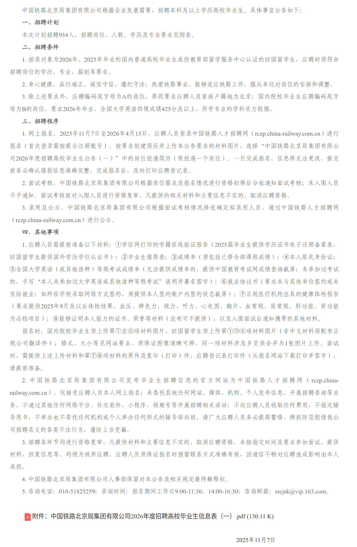 中国铁路北京局集团有限公司 2026年度招聘高校毕业生公告(一)