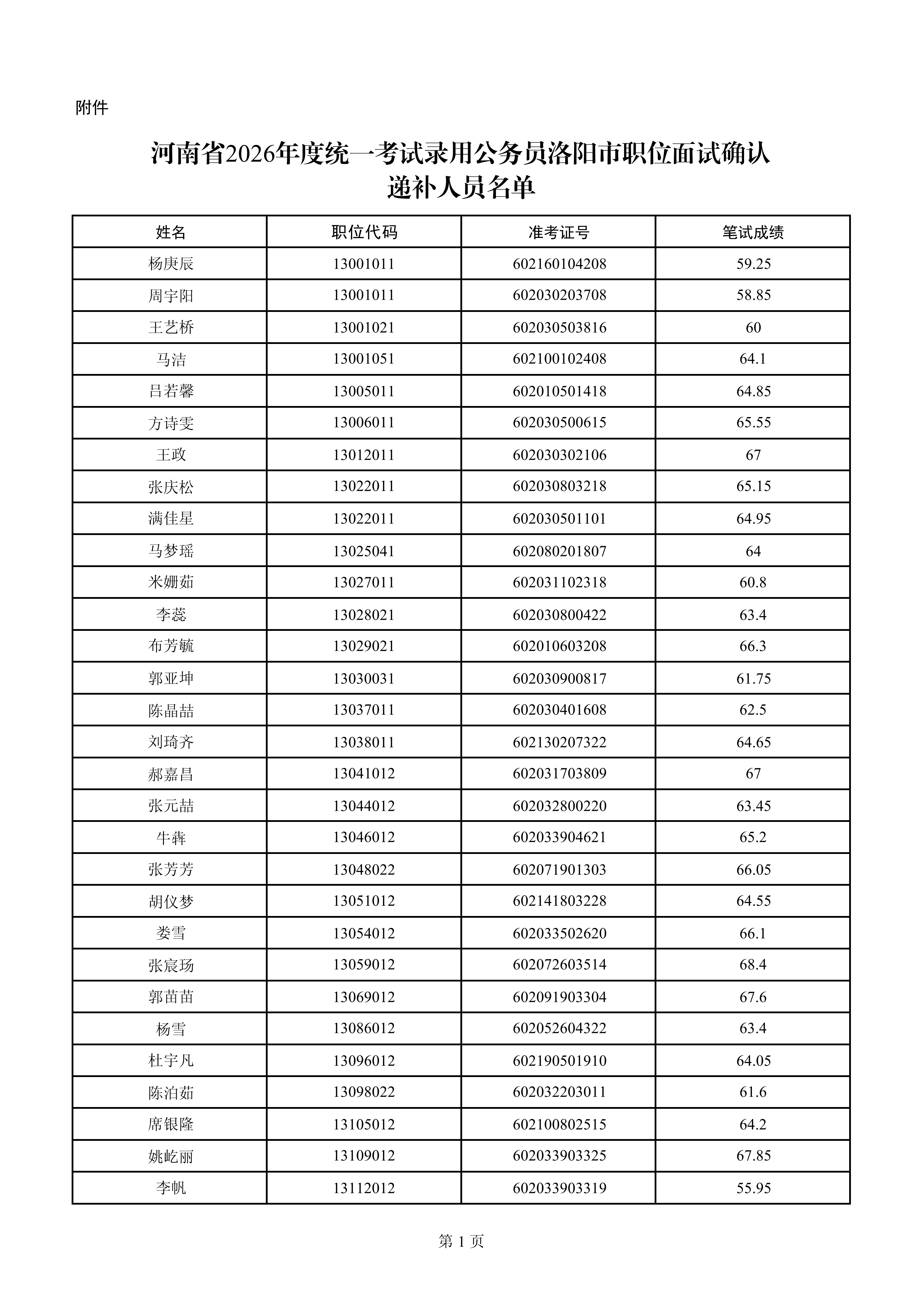 附件:河南省2026年度统一考试录用公务员洛阳市职位面试确认递补人员名单